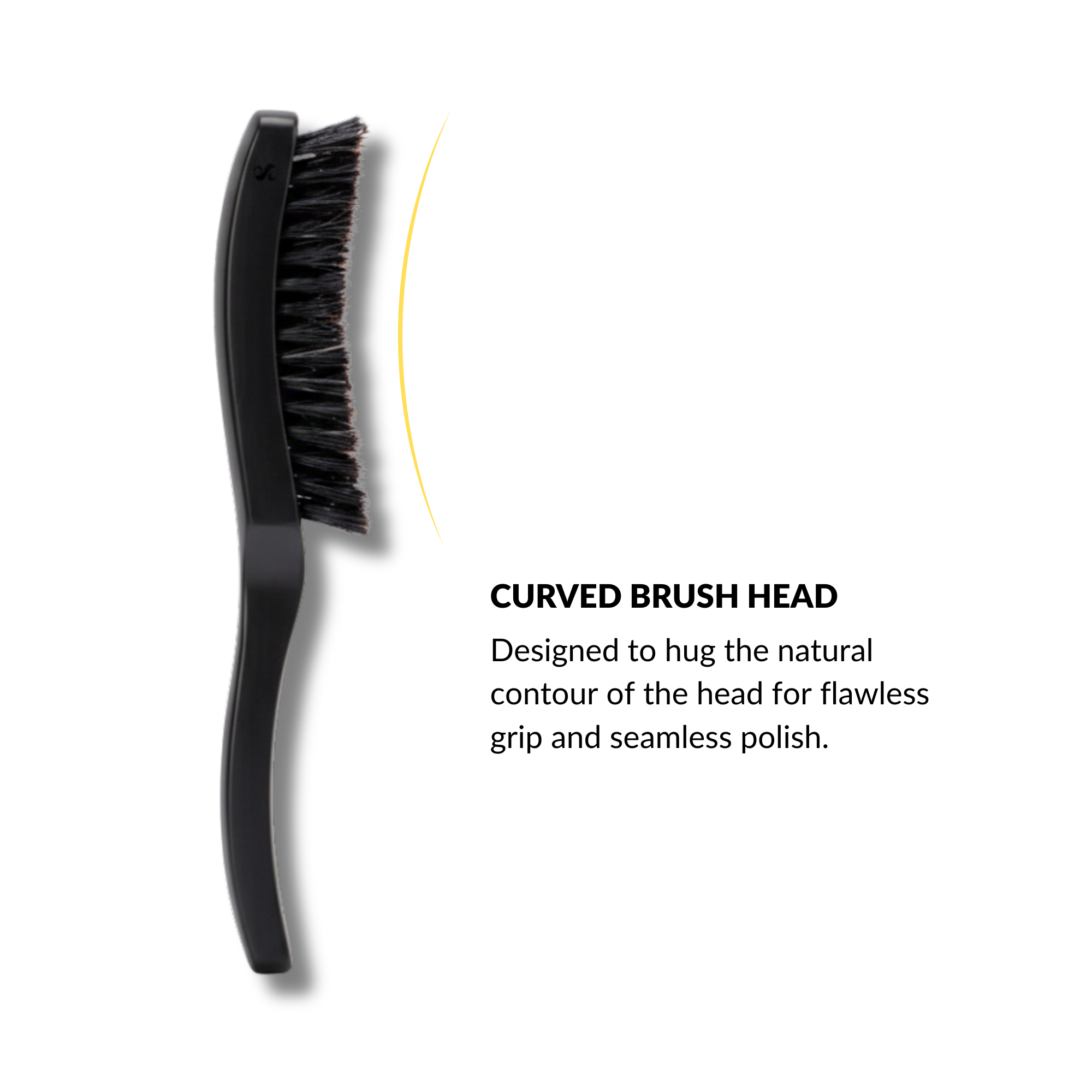 The curved brush head designed to hug the natural contour of the head for flawless grip and seamless polish.